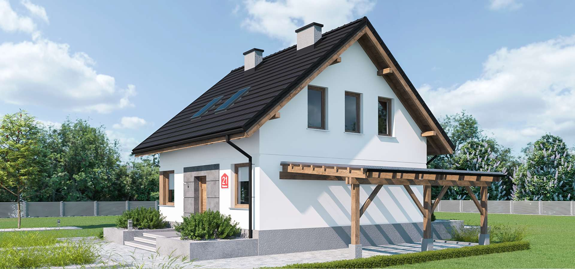Wnętrze rozplanowane jest bardzo funkcjonalnie. Na parterze znajduje się pokój dzienny z kominkiem i wyjściem do ogrodu, otwarta kuchnia, łazienka i dodatkowy pokój, a na poddaszu trzy przytulne sypialnie i wspólna łazienka. Ten nieduży dom z poddaszem użytkowym i wiatą garażową to ciekawa propozycja dla osób poszukujących sprawdzonych rozwiązań w nowoczesnym wydaniu.