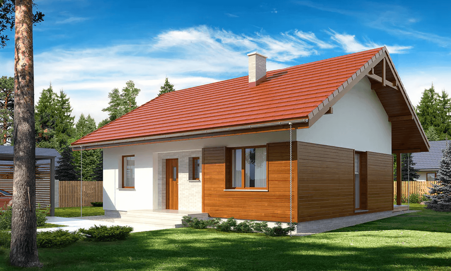 Jest to projekt domu szkieletowego o powierzchni użytkowej 68,45 m2 budowanego w technologii MDDOM, który zawiera przestronny salon z otwartą kuchnią oraz pomieszczeniem technicznym.