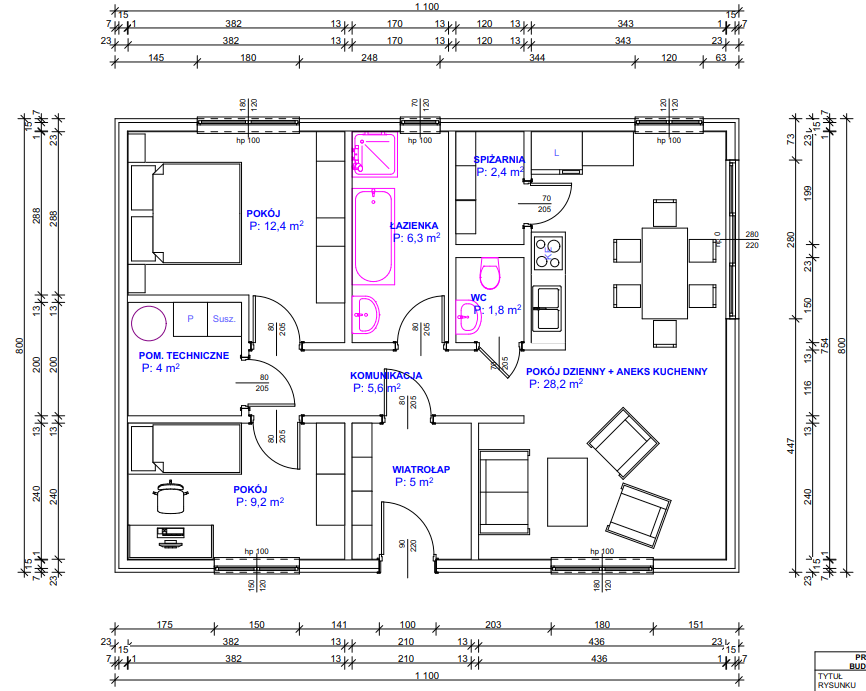 Strefa dzienna to salon z jadalnią i otwartą kuchnią.