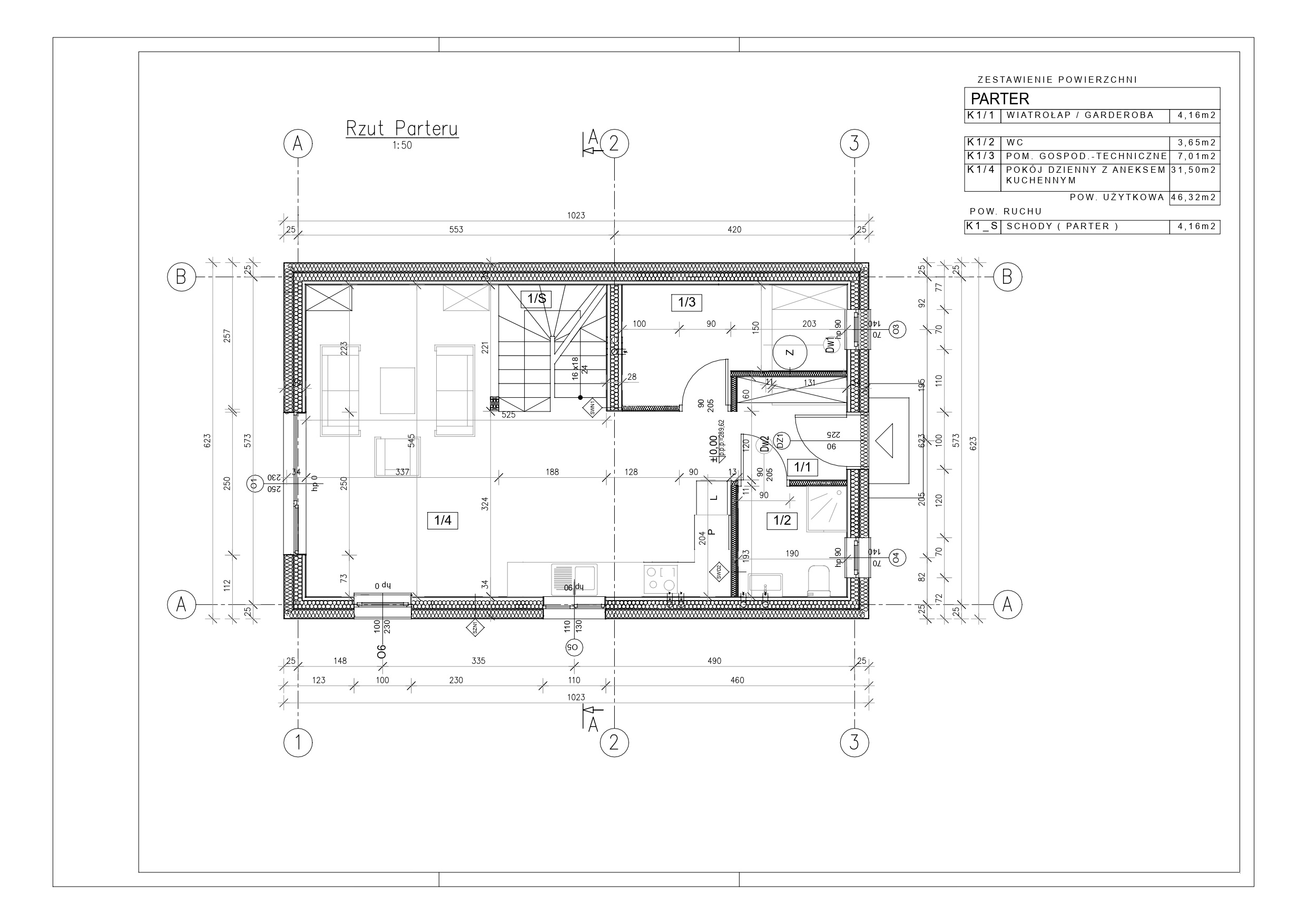 Na parterze mieści się również łazienka i pomieszczenie techniczne.