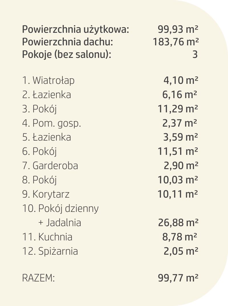 Dom w Awokado to projekt domu parterowego o powierzchni 99,77 m2. Projekt domu zakłada w strefie dziennej duży salon z kuchnią i jadalnią. W kuchni zaaranżowana jest również spiżarnia dla wygody przechowywania żywności. W strefie nocnej znajdują się 3 pokoje (sypialnie) oraz duża łazienka. Główna sypialnia posiada własną łazienkę i garderobę, co pozwoli gospodarzom domu na większą prywatność.