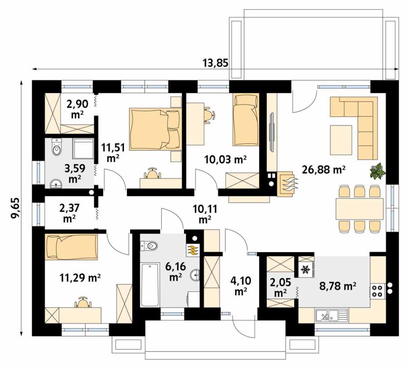 Projekt awokado to także jeden z najkorzystniejszych projektów domów parterowych jeśli chodzi o stosunek powierzchnia domu do jego ceny wybudowania. Bardzo wygodny układ domu oraz jego odpowiednia wielkość daje 4 osobowej rodzinie wygodne warunki do życia. Warto zainteresować się projektem domu awokado.