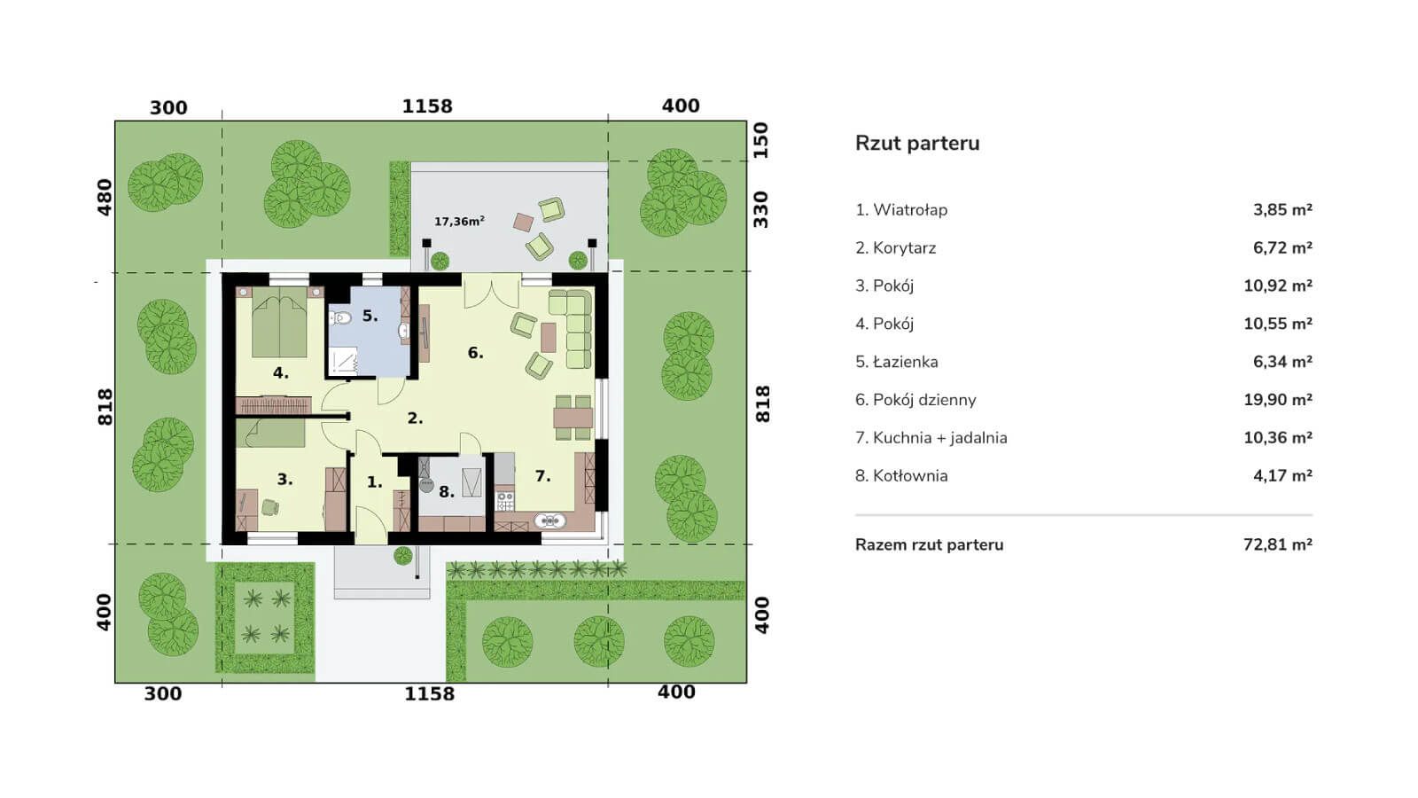 Inwestycja obejmowała wybudowanie domu szkieletowego parterowego o metrażu 76,5m2 w miejscowości Skrzyszów. W prezentowanym projekcie jest możliwość adaptacji poddasza, które ma ponad 50m2 powierzchni.