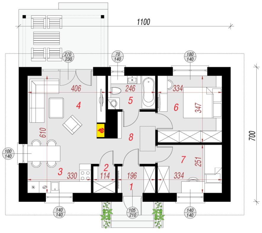 Tuż obok kuchni znajduje się spiżarnia, natomiast w łazience przewidziano miejsce na piec centralnego ogrzewania. Strefę nocną tworzą dwie jasne i ustawne sypialnie.