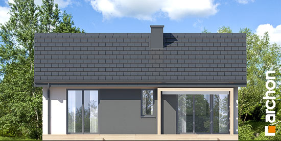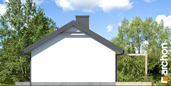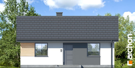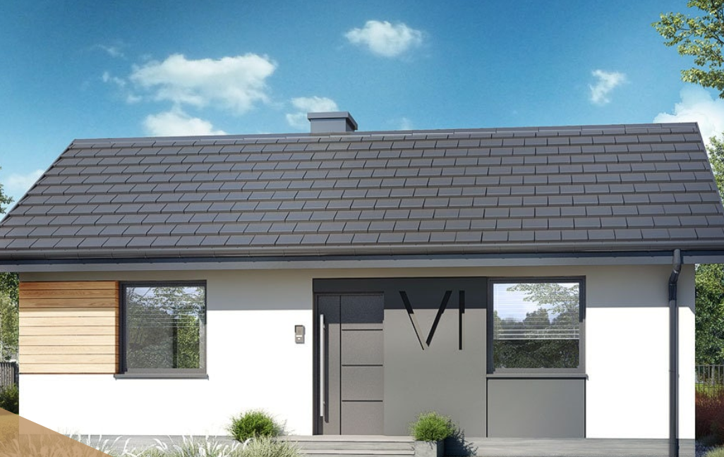 To parterowy budynek o prostej bryle z dachem dwuspadowym, który doskonale sprawdzi się w realizacji na wąskiej działce.