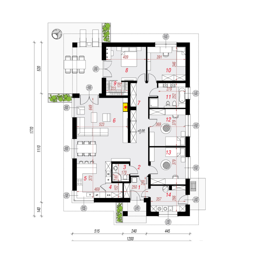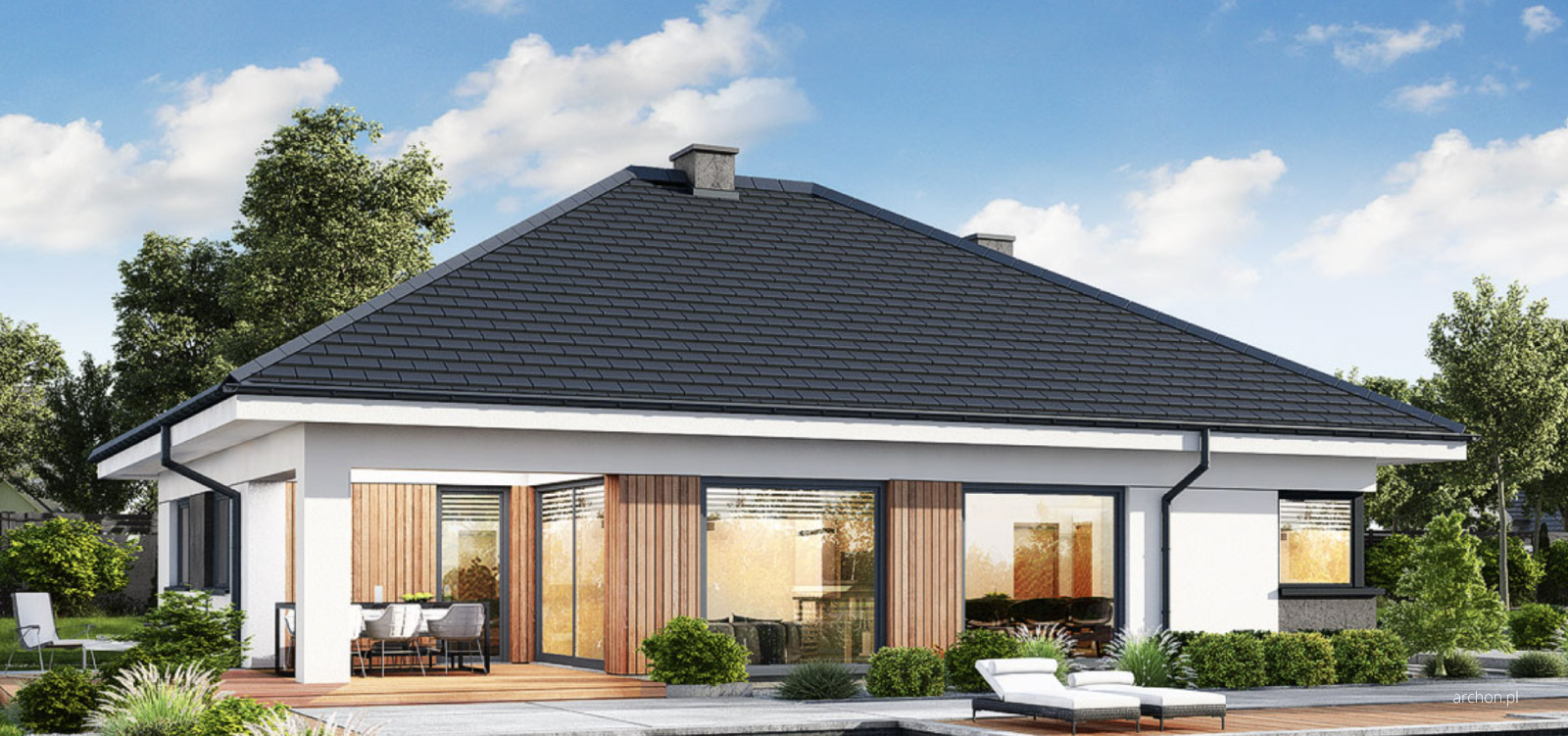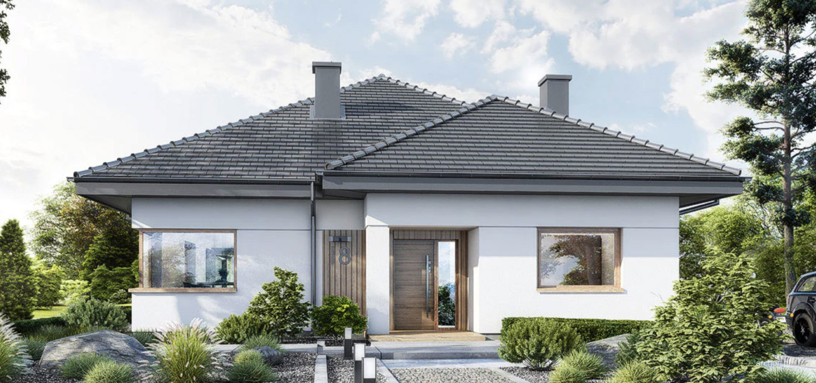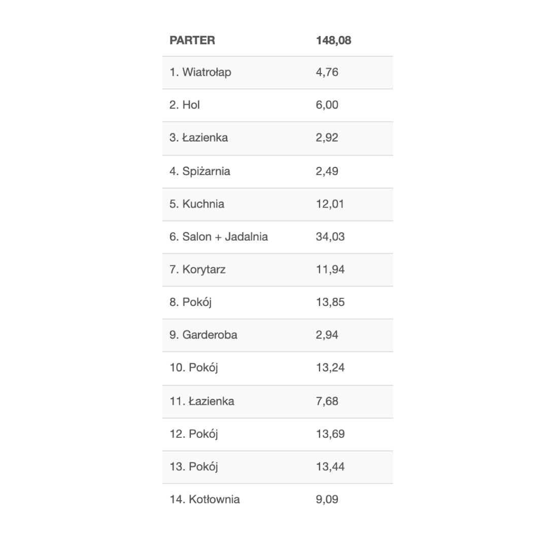 Dom w Renklodach 17 to projekt domu parterowego, który charakteryzuje się bardzo wyraźnym oddzieleniem strefy dziennej od strefy nocnej domu. W założeniach projektu powierzchnia domu to 148,08m2. Projekt domu szkieletowego zakłada w swoich wnętrzach Duży salon z jadalnią i pół otwartą kuchnią i spiżarnią, W przestrzeni sypialno-nocnej znajdują się 3 pokoje oraz sypialnia główna z garderobą. Dodatkowo duża łazienka oraz wspólna część w korytarzu jako miejsce na szafę pod zabudowę. Projekt przewiduje również duże pomieszczenie gospodarcze połączone z pralnią.