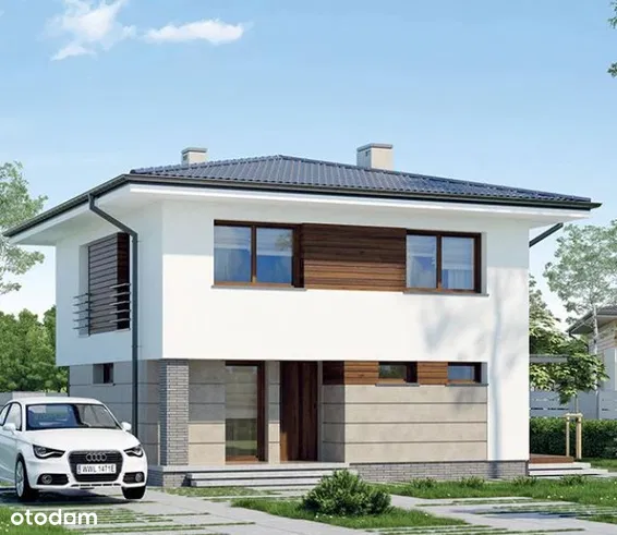 Dom z poddaszem użytkowym w konstrukcji nowoczesnej „kostki”, który jest ciekawym nowym wydaniem dawnych domów „kostka”.