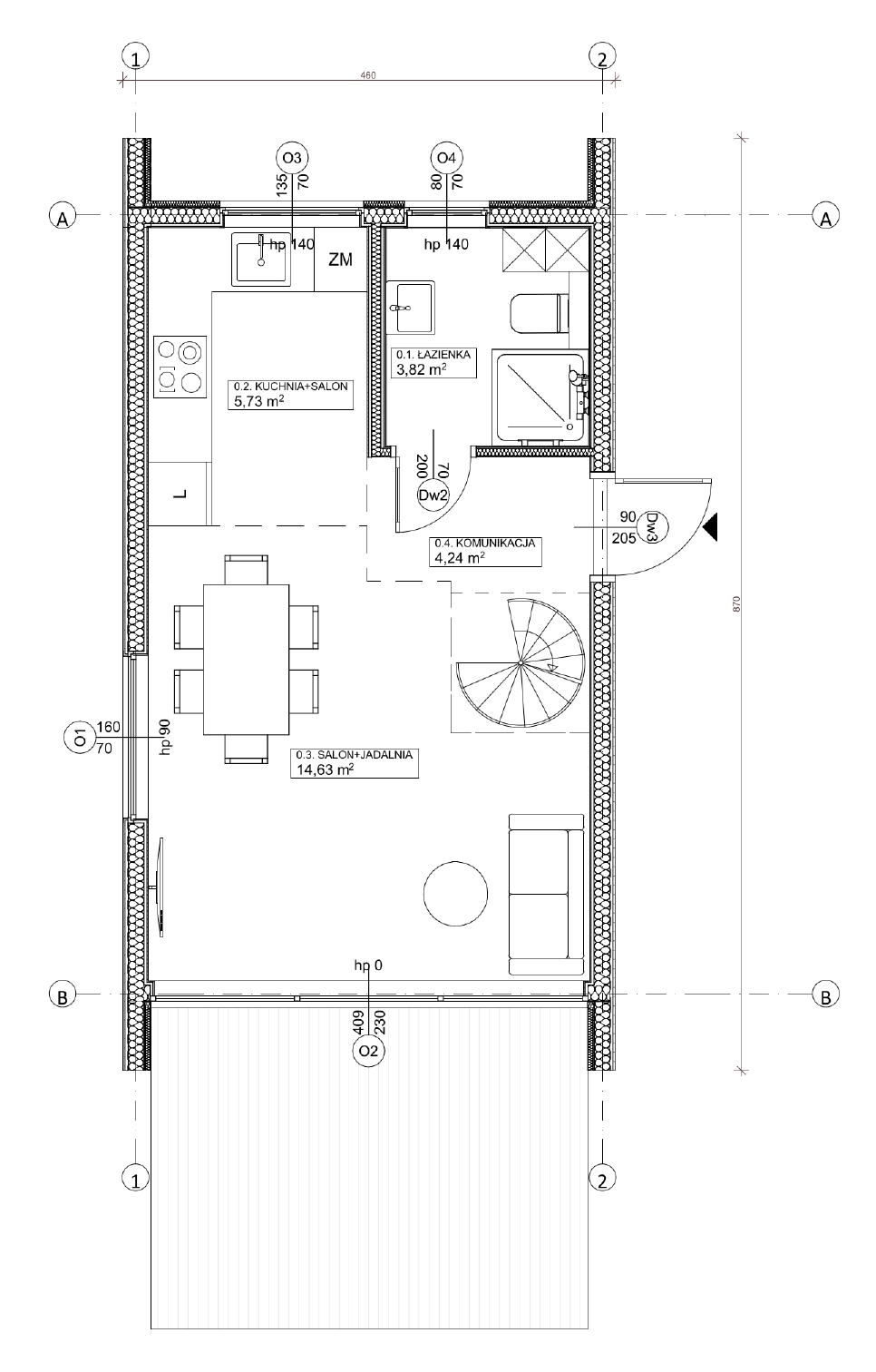 Projekt MDDOM 44 v 1, który jest domem rekreacji indywidualnej. W projekcie przewidziano przestronny salon z otwartą kuchnią wraz z toaletą. Zawiera on również antresolę.