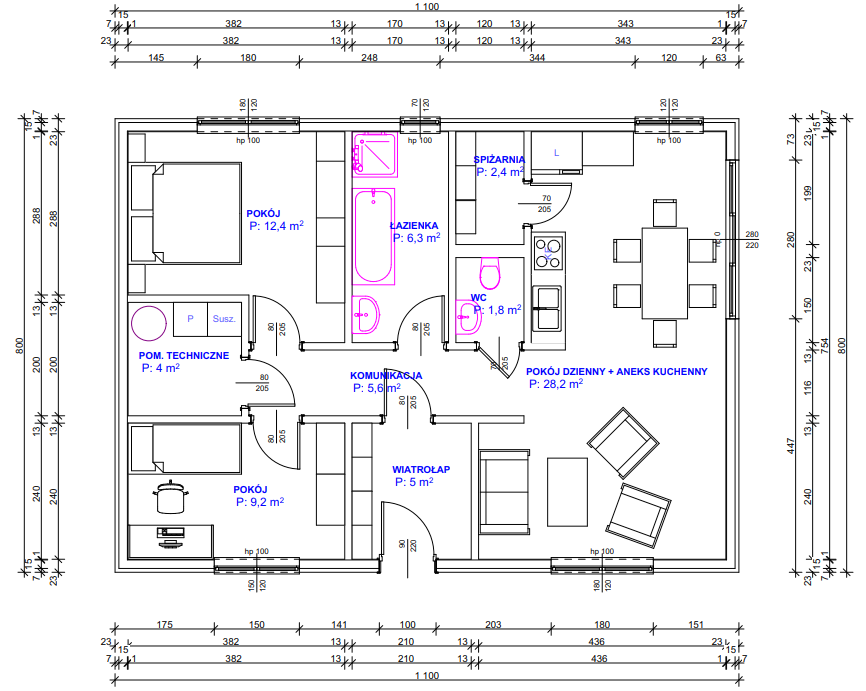 Dodatkowo projekt zawiera łazienkę oraz WC, a także pomieszczenie techniczne.