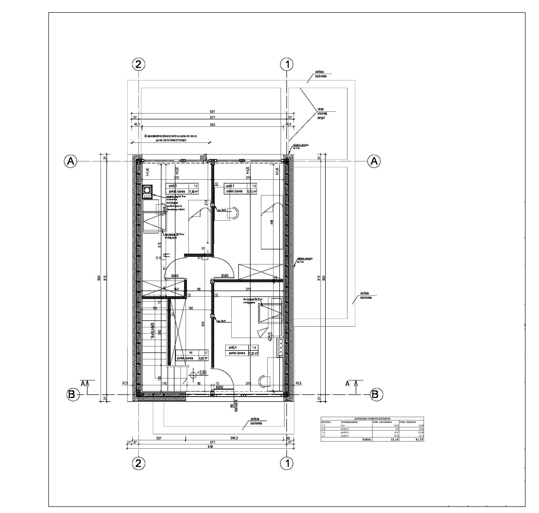Na parterze zaplanowano przestronny pokój dzienny, kuchnię, łazienkę oraz praktyczne pomieszczenie gospodarcze, co gwarantuje wygodę codziennego użytkowania.