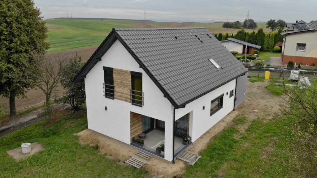Galeria zdjęć Opis projektu Inwestycja obejmowała wybudowanie domu szkieletowego piętrowego o metrażu 111,45m2 w miejscowości Łaziska Górne. Projekt domu zakładał