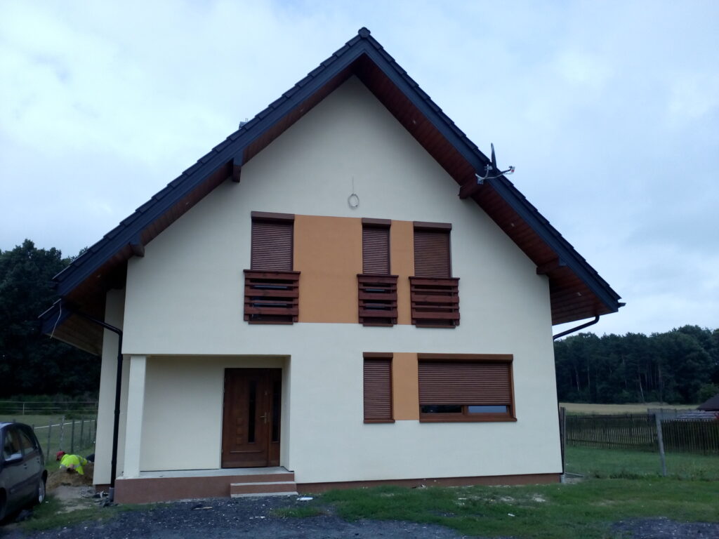 Galeria zdjęć Opis projektu Inwestycja obejmowała wybudowanie domu szkieletowego piętrowego o metrażu 110m2 w miejscowości Knurów. Projekt domu zakładał 3